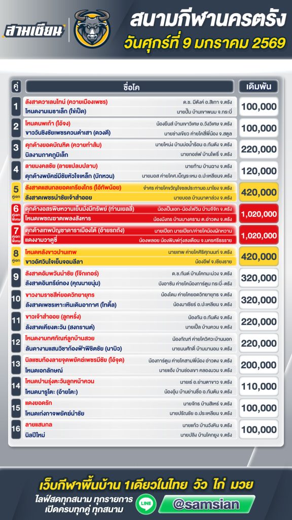 โปรแกรมวัวชน สนามกีฬาชนโคนครตรัง วันที่9 มกราคม 2569
