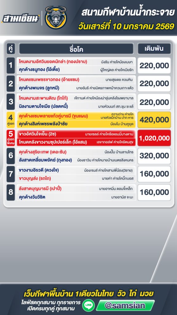 โปรแกรมวัวชน สนามกีฬาชนโคบ้านน้ำกระจาย วันที่10 มกราคม 2569