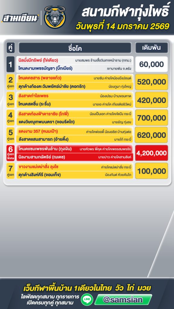 สรุปผล สนามชนโคบ้านเสาธง วันที่13 มกราคม 2569