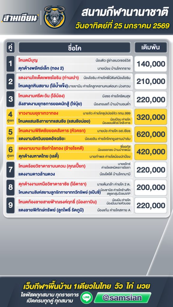 โปรแกรมวัวชน สนามกีฬาชนโคพระเเสง วันที่25 มกราคม 2569