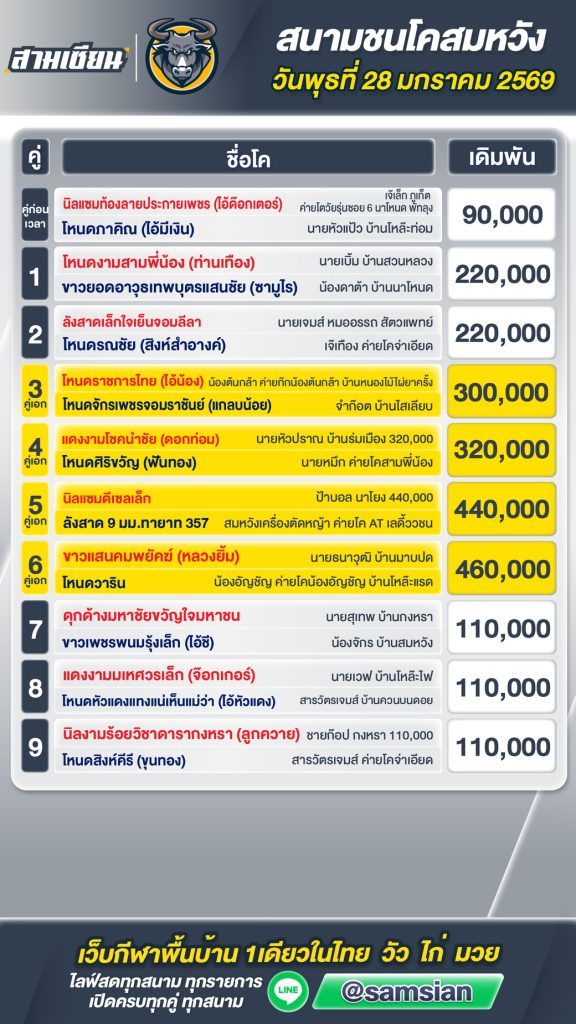 โปรแกรมวัวชน สนามกีฬาชนโคบ้านสมหวัง วันที่28 มกราคม 2569