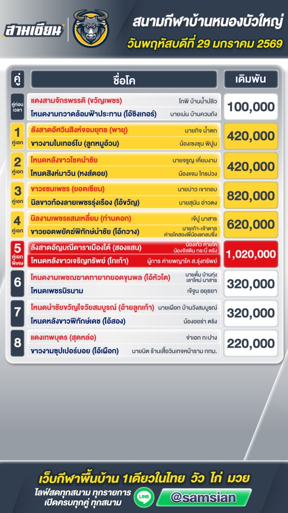 โปรแกรมวัวชน สนามกีฬาชนโคบ้านหนองบัวใหญ่ วันที่29 มกราคม 2569