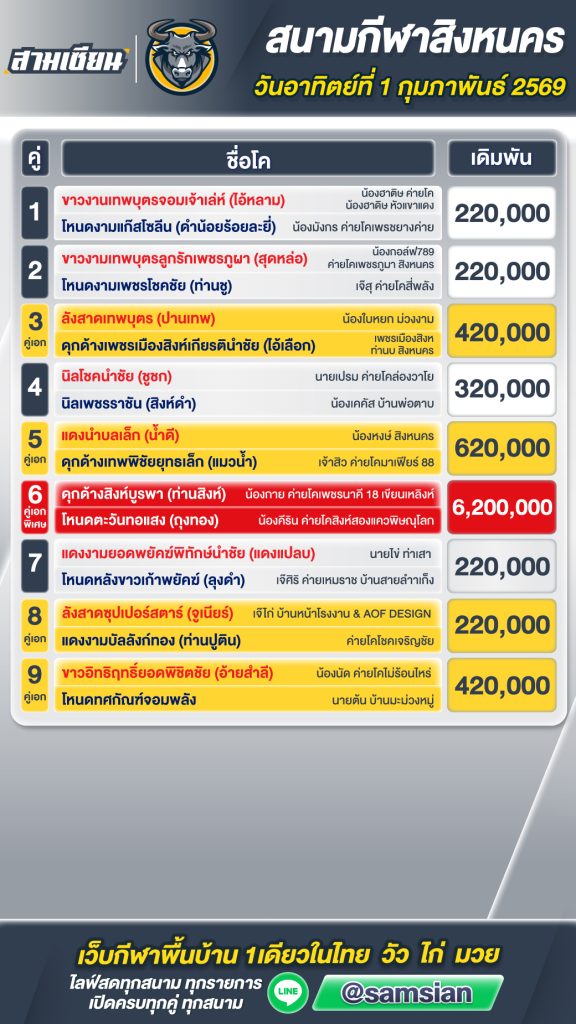 โปรแกรมวัวชน สนามกีฬาชนโคสิงหนคร วันที่1 กุมภาพันธ์ 2569