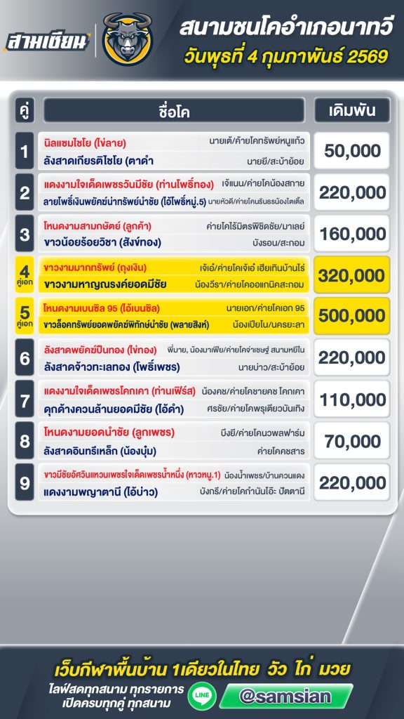 โปรแกรมวัวชน สนามกีฬาชนโคนาทวี วันที่ 4 กุมภาพันธ์ 2569