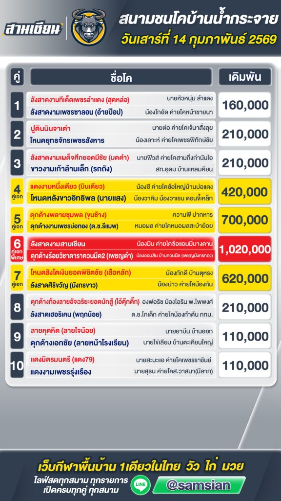 โปรแกรมวัวชน สนามกีฬาชนโคน้ำกระจาย วันที่ 14 กุมภาพันธ์ 2569
