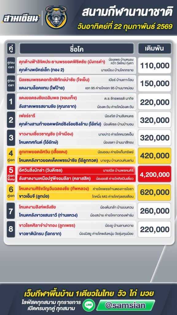 โปรแกรมวัวชน สนามกีฬาชนโคนานาชาติ วันที่ 22 กุมภาพันธ์ 2569