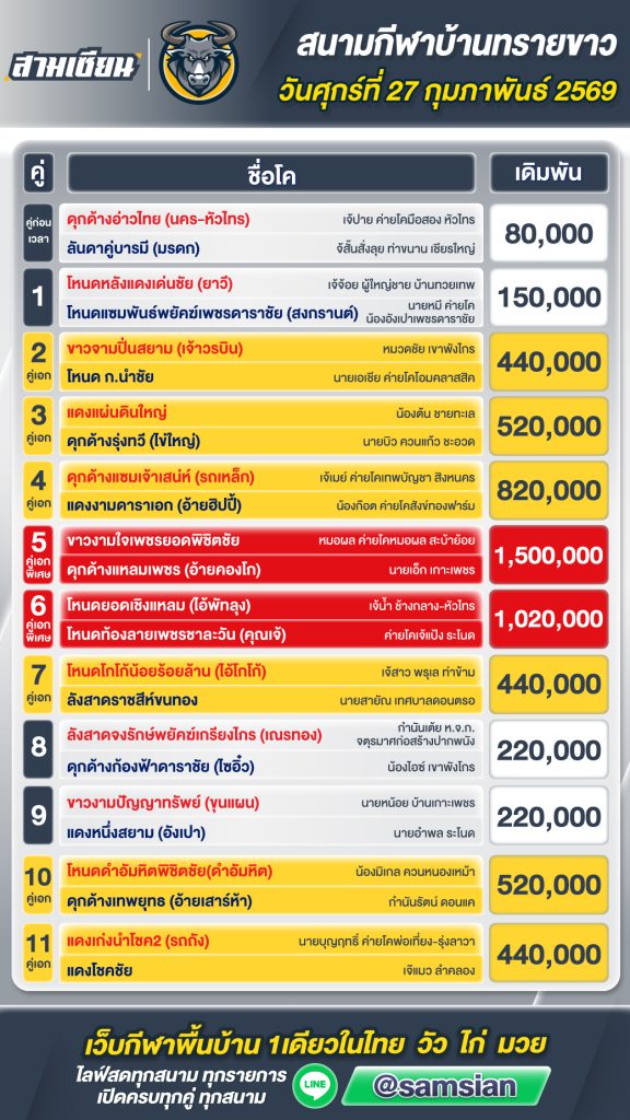 โปรแกรมวัวชน สนามกีฬาชนโคทรายขาว วันที่ 27 กุมภาพันธ์ 2569