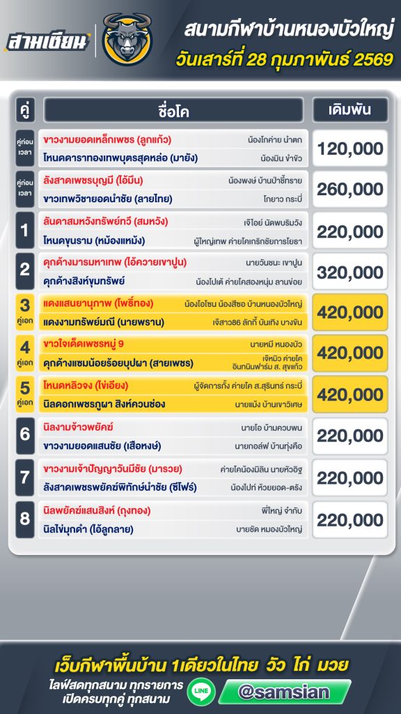 โปรแกรมวัวชน สนามกีฬาชนโคหนองบัวใหญ่ วันที่ 28 กุมภาพันธ์ 2569