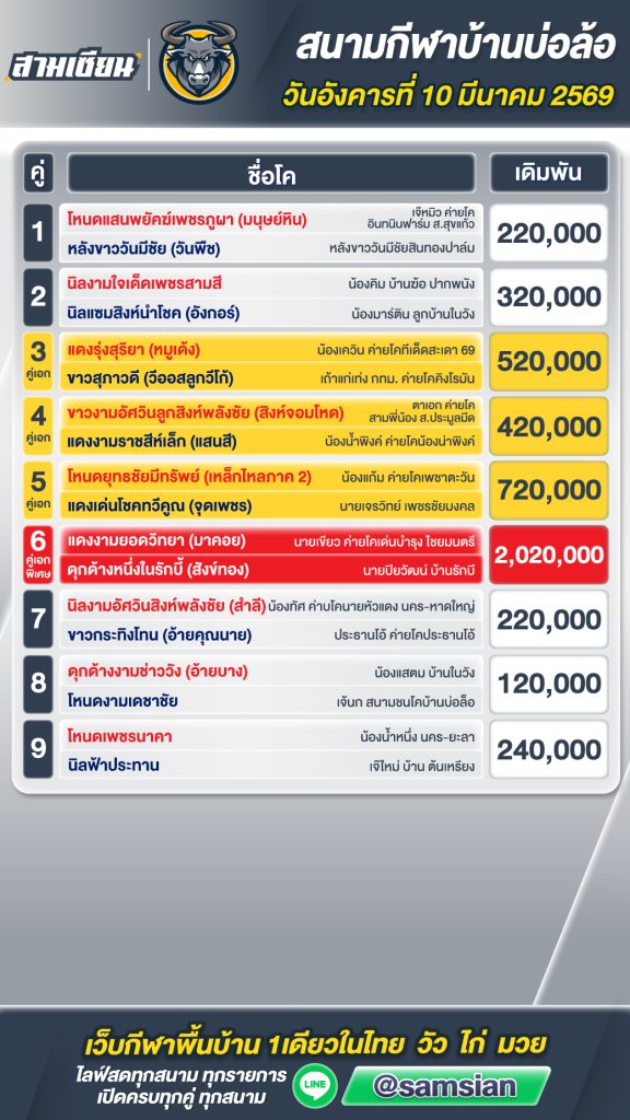 โปรแกรมวัวชน สนามกีฬาชนโคบ่อล้อ วันที่ 10 มีนาคม 2569