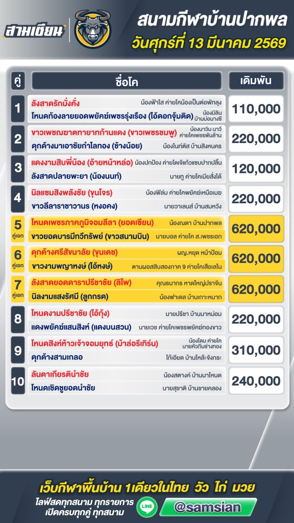 โปรแกรมวัวชน สนามกีฬาชนโคปากพล วันที่ 13 มีนาคม 2569