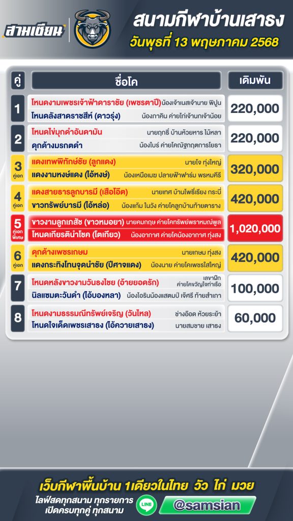 โปรแกรมวัวชน สนามกีฬาชนโคบ้านเสาธง วันที่ 14 พฤษภาคม 2568